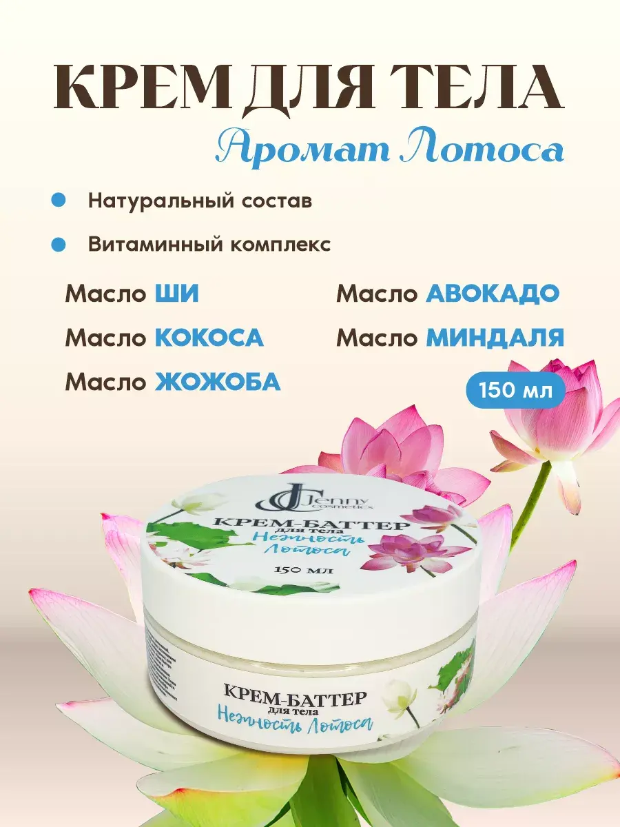 Крем для тела с ароматом нежного лотоса. Крем обладает на 100% органическим безопасным составом натуральных масел. Увлажняющее масло для тела создано для всех типов кожи. Длительное применение крема для тела питательного помогает против растяжек, пигментных пятен, раздражения и увядания кожи, сухой кожи. Крем баттер для тела станет источником витаминов А и Е, необходимых для здоровья эпидермиса. Масло для массажа с маслом ши имеет целебные свойства. Ши или карите богато жирными кислотами, которые запускают синтез коллагена в коже, разглаживают и восстанавливают. Жиры в составе масла ши образуют невидимый барьер и служат естественной защитой от УФ-лучей и других факторов. Антиоксидантные свойства карите препятствуют пагубному влиянию свободных радикалов. Крем для сухой кожи с маслом кокоса - это сосредоточение витаминов, минералов и ценных жиров, которое наполняет кожу живительной влагой и удерживает ее в коже. Масло кокоса действенно на проблемных загрубевших участках: локтях, пятках, коленях. Увлажняющий крем для тела с миндальным маслом против растяжек. Миндальное масло необходимо обладательницам чувствительной кожи. Аминокислоты в составе миндаля борются с пигментацией, уменьшая выявленность пятен и пост-акне. Крем-масло для тела с жажоба способно заживлять и питать. Жожоба подходит увядающей и жирной коже. Аминокислоты в его составе поддерживают эластичность. Лифтинг-эффект применения на зоне декольте и против целлюлита приятно порадует. Моментальное увлажнение для сухой кожи обеспечит масло авокадо. Жирные кислоты авокадо и микроэлементы борются с высыпаниями и раздражением на коже. Помогает коже избавиться от токсинов и обрести ровный тон. Питательный крем-баттер содержит сквалан. Он защищает кожу от внешних факторов, предупреждает преждевременное старение и способствует удержанию влаги в слоях дермы. Крем от растяжек дополнен заживляющим пантенолом. Крем баттер SOS действует в течение 24 часов после нанесения. После загара отлично успокоит и увлажнит кожу.