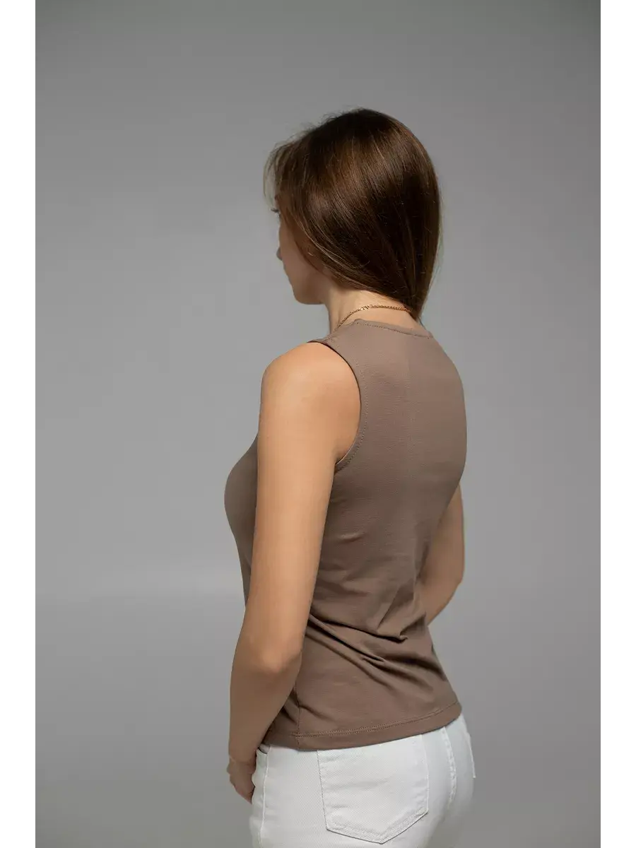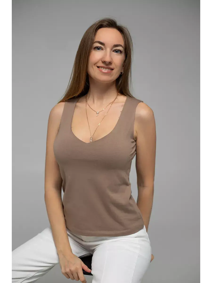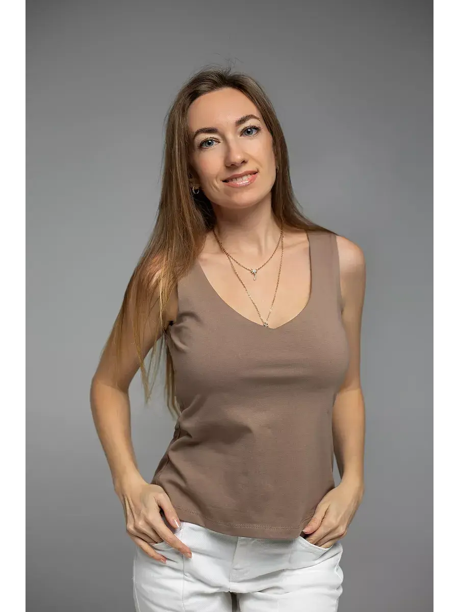 Ключевые слова: женская майка, V-образный вырез, приталенный силуэт, хлопок, широкие бретели, комфорт, стиль, повседневная одежда, универсальный гардероб, офис, под пиджак.