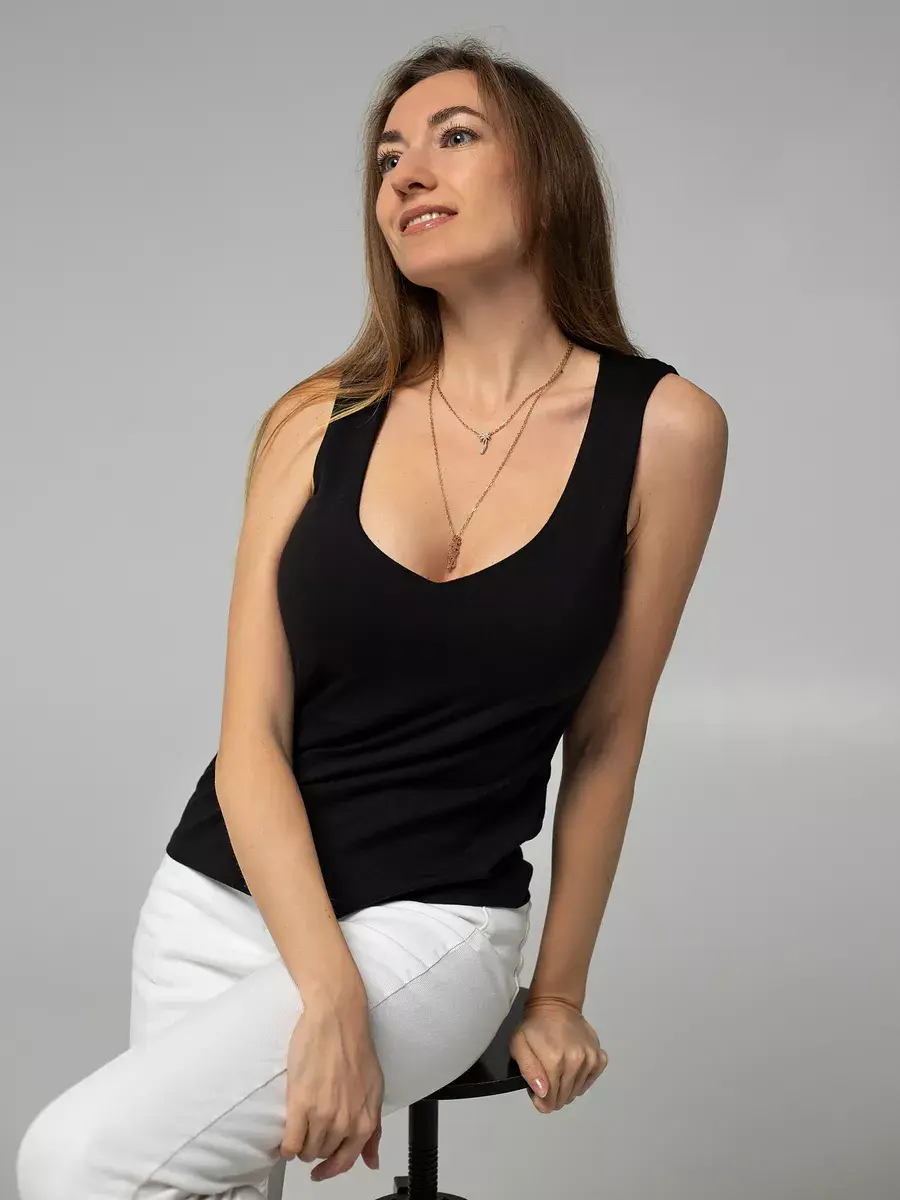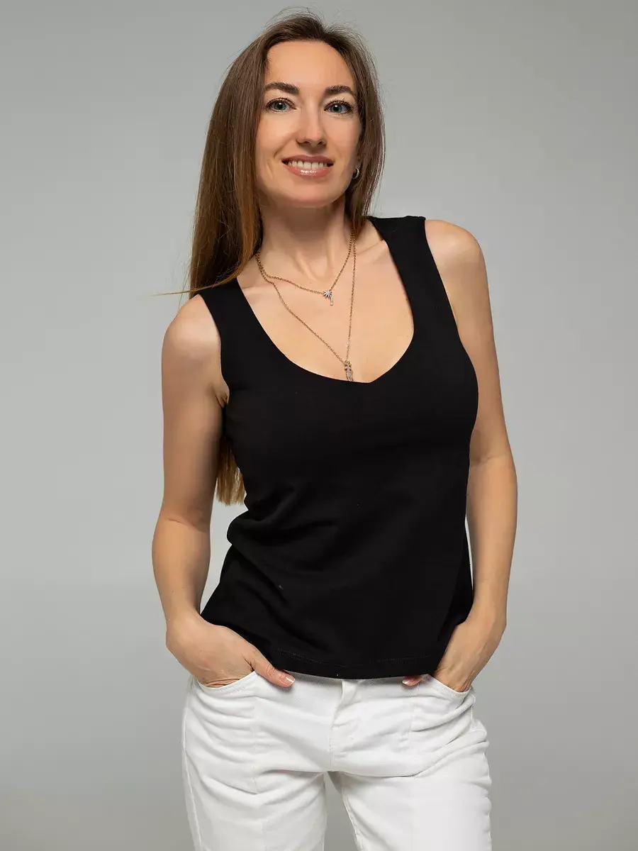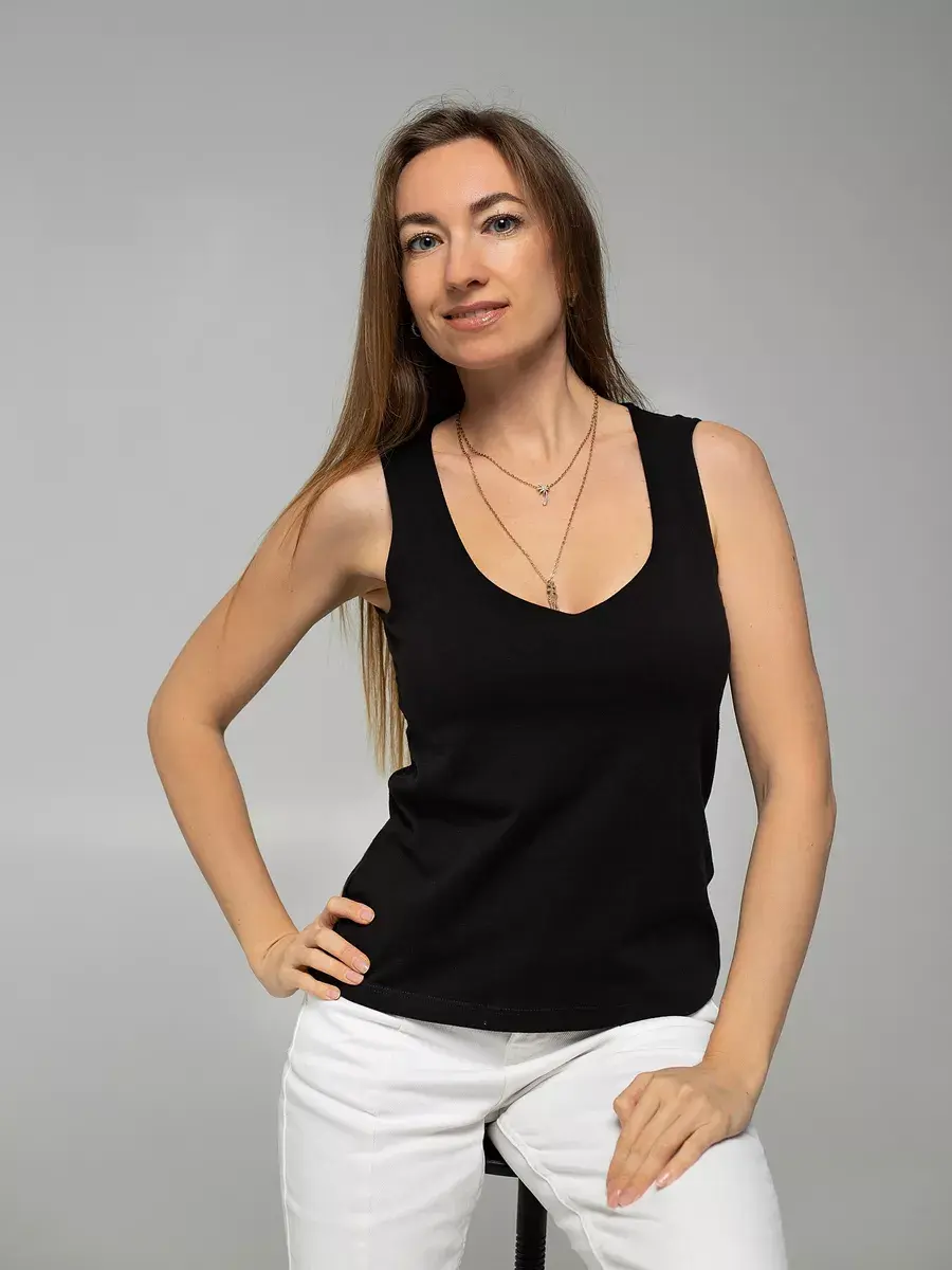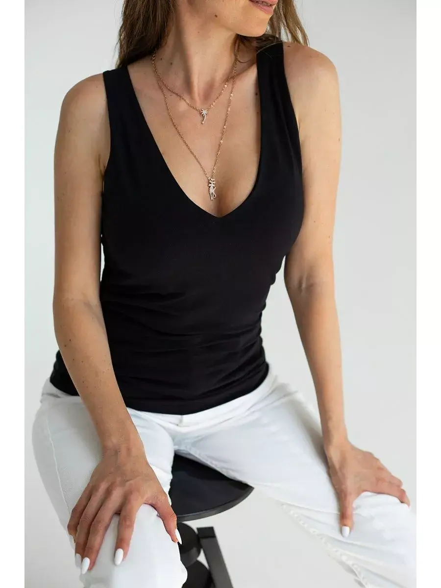 Майка женская под пиджак с глубоким вырезом от бренда EvieVerdi – это идеальный выбор для тех, кто ценит комфорт и стиль в повседневной жизни. Широкие бретели и V-образный вырез добавляют удобство и элегантность, делая её отличным выбором для офисной одежды, повседневного ношения или домашнего комфорта. Двойной подклад в зоне груди обеспечивает дополнительную поддержку и удобство. Благодаря своему универсальному дизайну без рисунка, эта майка подходит для любых ситуаций и легко сочетается с различными стилями одежды. Выбирайте ее для создания стильного и комфортного образа каждый день. У нас есть акции и распродажи, вы можете купить наши товары в подарок со скидкой!