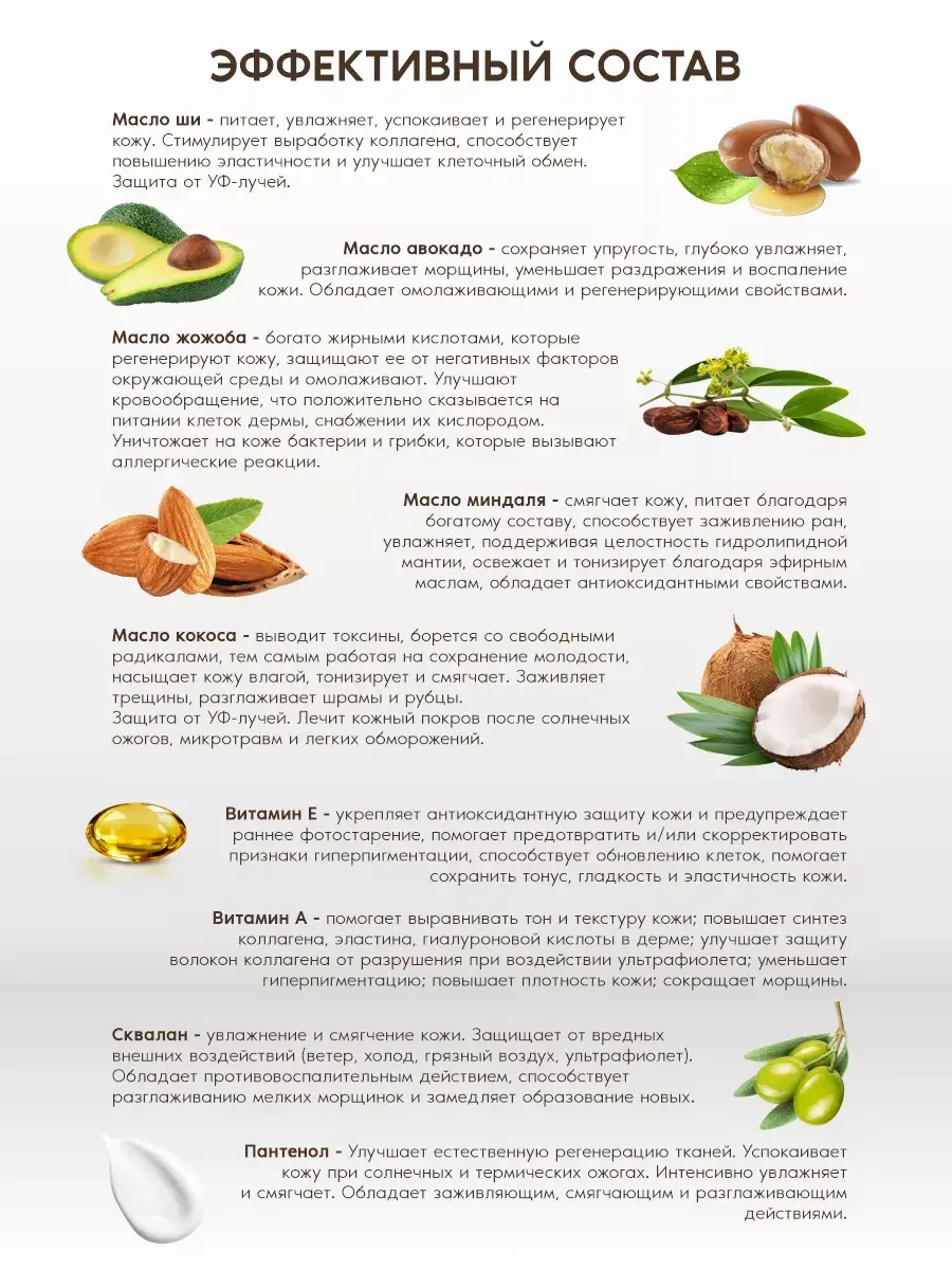 Крем для тела с ароматом. Крем обладает на 100% органическим безопасным составом натуральных масел. Увлажняющее масло для всех типов кожи. Длительное применение крема для тела питательного помогает против растяжек, пигментных пятен, раздражения и увядания кожи, сухой кожи. Крем баттер для тела станет источником витаминов А и Е, необходимых для здоровья эпидермиса. Масло для массажа с маслом ши имеет целебные свойства. Ши или карите богато жирными кислотами, которые запускают синтез коллагена в коже, разглаживают и восстанавливают. Жиры в составе масла ши образуют невидимый барьер и служат естественной защитой от УФ-лучей и других факторов. Антиоксидантные свойства карите препятствуют пагубному влиянию свободных радикалов. Крем для сухой кожи с маслом кокоса - это сосредоточение витаминов, минералов и ценных жиров, которое наполняет кожу живительной влагой и удерживает ее в коже. Масло кокоса действенно на проблемных загрубевших участках: локтях, пятках, коленях. Увлажняющий крем для тела с миндальным маслом против растяжек. Миндальное масло необходимо обладательницам чувствительной кожи. Аминокислоты в составе миндаля борются с пигментацией, уменьшая выявленность пятен и пост-акне. Крем-масло для тела с жажоба способно заживлять и питать. Жожоба подходит увядающей и жирной коже. Аминокислоты в его составе поддерживают эластичность. Лифтинг-эффект применения на зоне декольте и против целлюлита приятно порадует. Моментальное увлажнение для сухой кожи обеспечит масло авокадо. Жирные кислоты авокадо и микроэлементы борются с высыпаниями и раздражением на коже. Помогает коже избавиться от токсинов и обрести ровный тон. Питательный крем-баттер содержит сквалан. Он защищает кожу от внешних факторов, предупреждает преждевременное старение и способствует удержанию влаги в слоях дермы. Крем от растяжек дополнен заживляющим пантенолом. Крем баттер SOS действует в течение 24 часов после нанесения. Рекомендовано после загара.